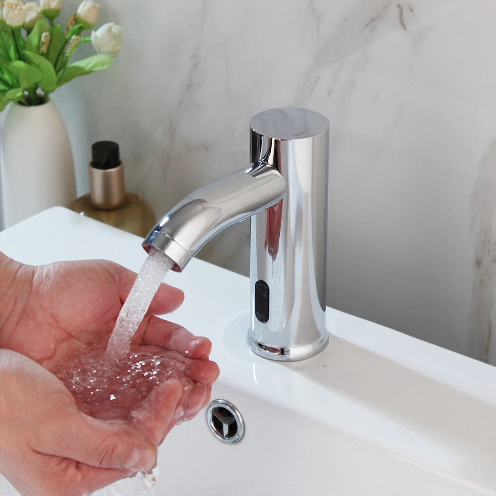 Berührungsloser Waschtischmischer mit langlebiger Chromoberfläche. Das Kaltwassermodell startet/stoppt automatisch über einen Infrarotsensor und verfügt über Keramikscheiben für einen reibungslosen, tropffreien Betrieb. Ideal für hygienische Anwendungen in öffentlichen Räumen, Büros und Restaurants.