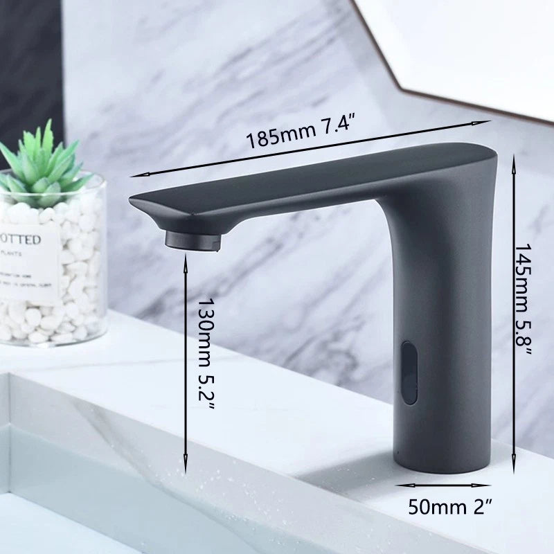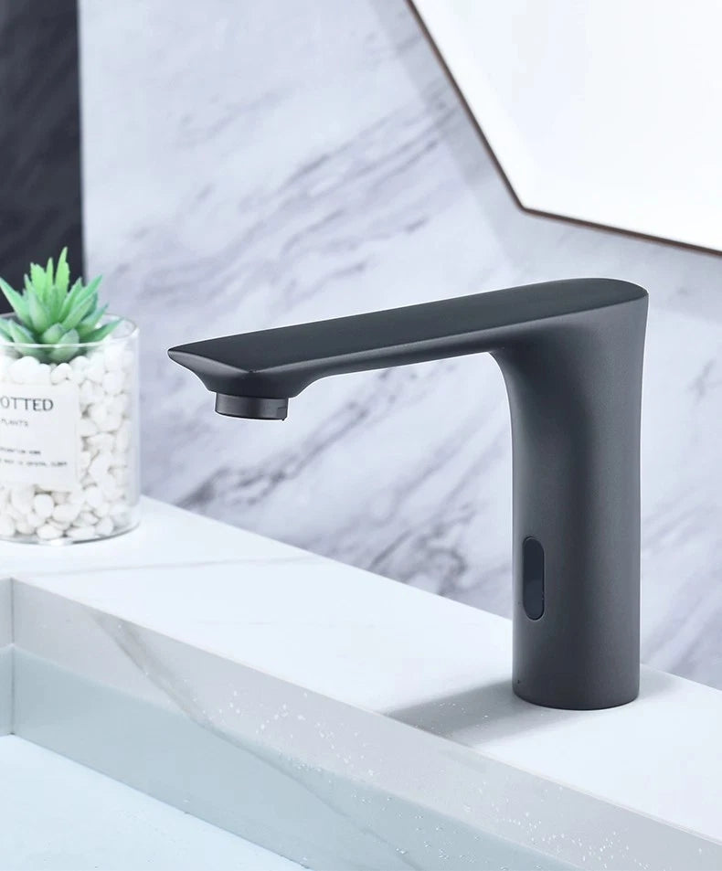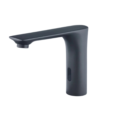 Moderne sensorkraan met strakke gunmetal afwerking voor hygiënisch, touchless gebruik. De sensor activeert de waterstroom automatisch, waardoor contact en verspilling verminderen—ideaal voor toiletruimtes en badkamers.