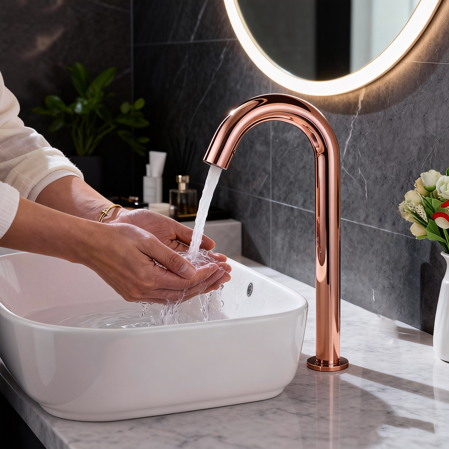 De Sensomatica Cesaro in rose goud is een elegante sensorkraan met extra hoge uitloop (330 mm), ideaal voor (opbouw)waskommen en moderne sanitaire ruimtes. Dankzij de sensorbediening werkt u hygiënisch, comfortabel en waterbesparend.