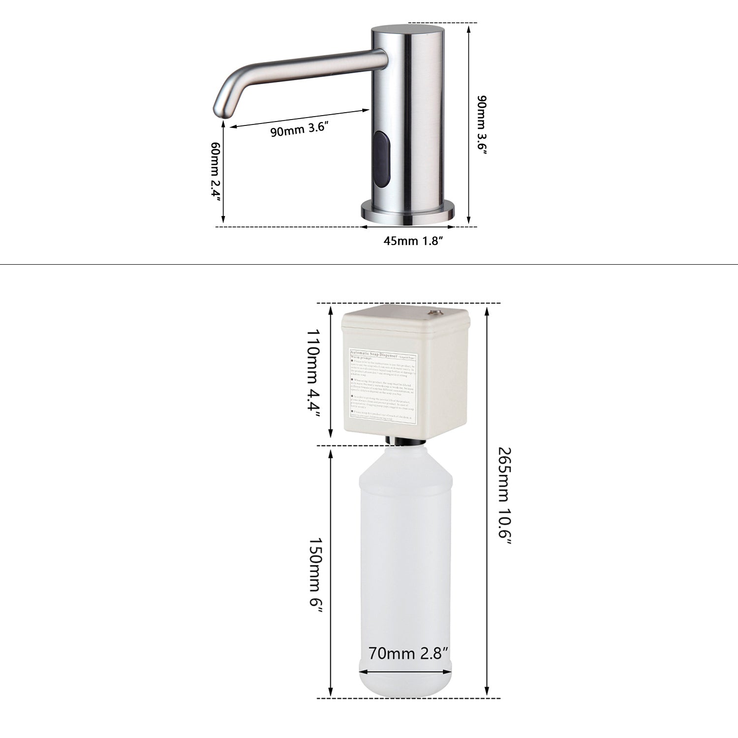 - ✅ Afmetingen: kop hoogte 90 mm; uitloop 90 mm; halsdiameter 35 mm; afwerkrozet 45 mm; onderbouwreservoir totaal 345 mm (bovenstuk 110 mm + fles 230 mm); kraangat 33–40 mm