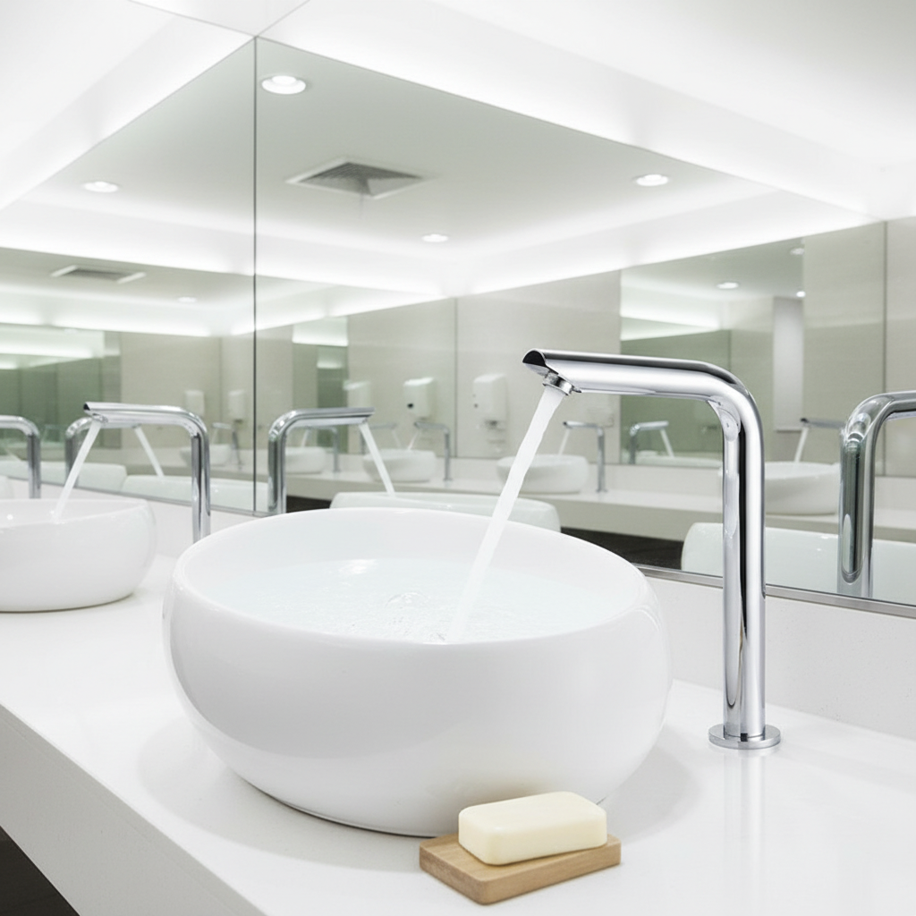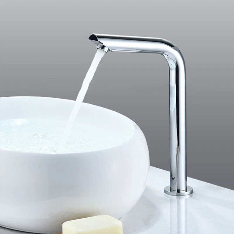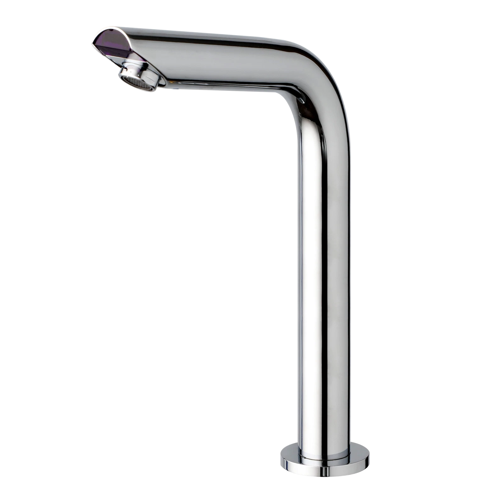 Hoog model sensorkraan van Sensomatica in chroom. De infraroodsensor zorgt voor hygiënisch, contactloos handenwassen. Geschikt voor woningen en drukbezochte sanitaire ruimtes. Standaard met batterij- én netstroomoptie voor flexibele installatie.
