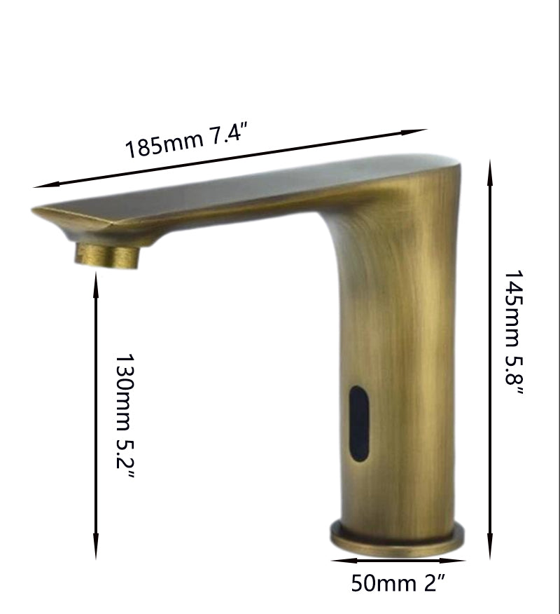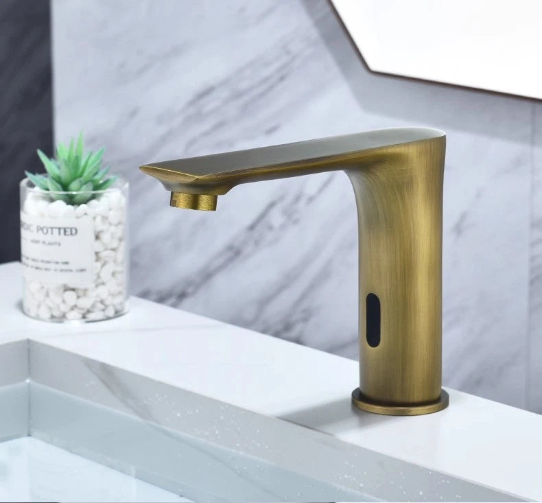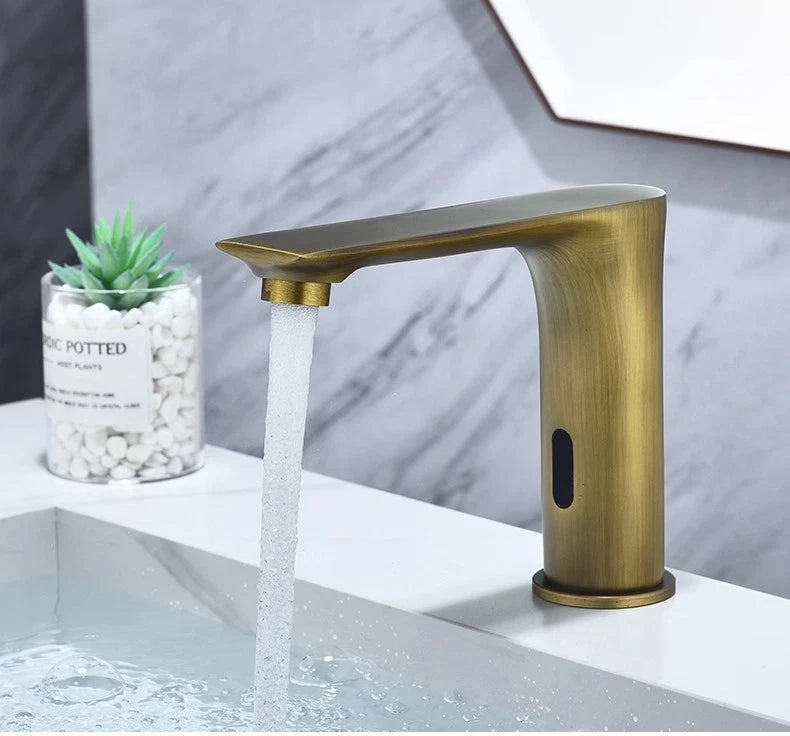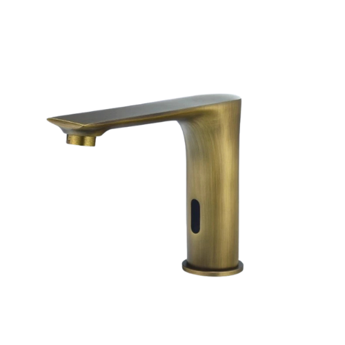 Stijlvolle sensorkraan in bronskleurige afwerking voor hygiënisch, touchless gebruik. De sensor activeert de waterstroom automatisch, waardoor contact en verspilling verminderen—perfect voor toiletten en badkamers.