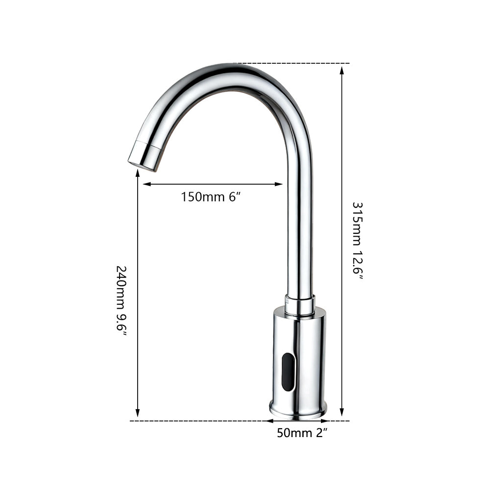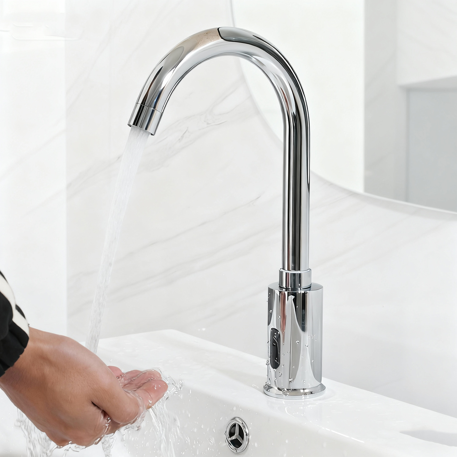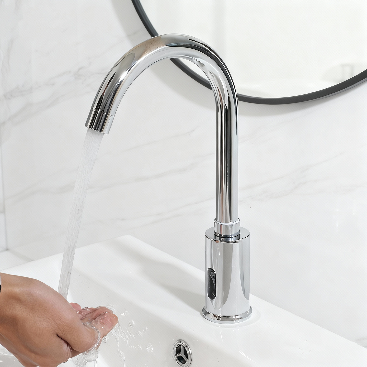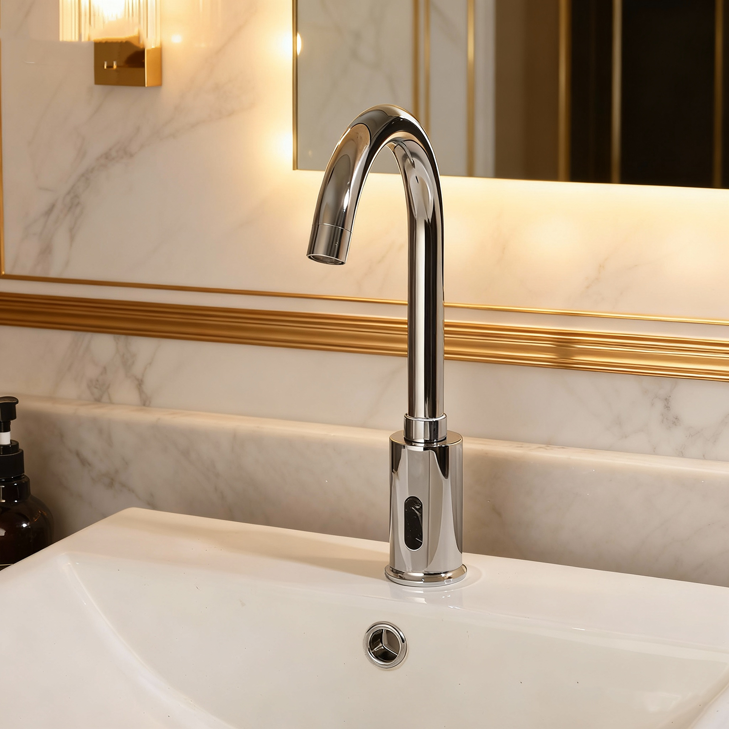 De Sensomatica Alto is een stijlvolle chroom sensorkraan met handvrije bediening. Het water start automatisch wanneer je je handen bij de sensor houdt en stopt direct bij wegnemen — hygiënisch en zuinig voor thuis en commercieel gebruik.
