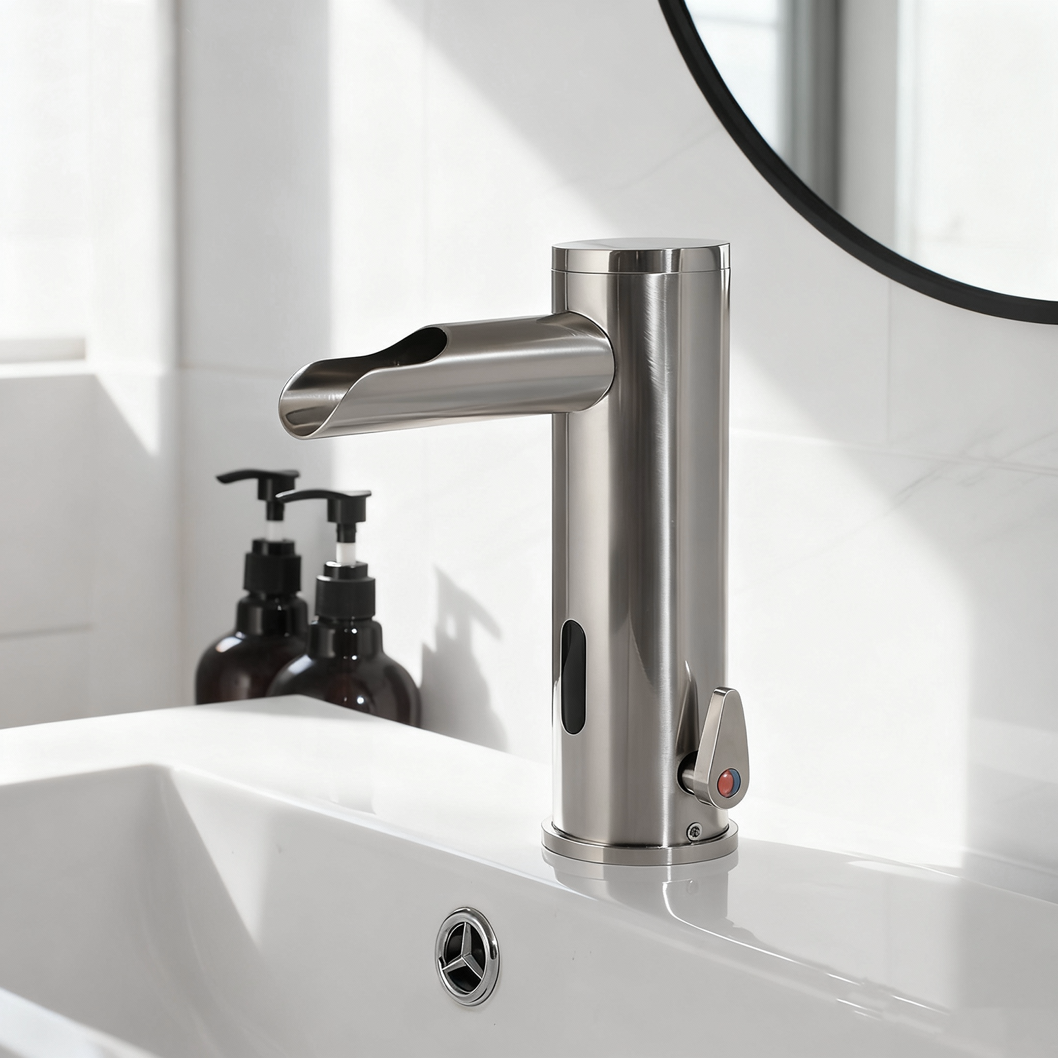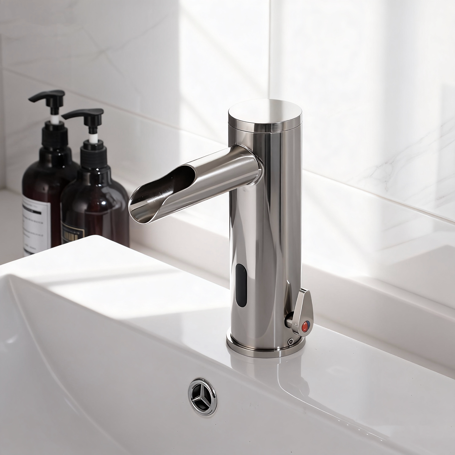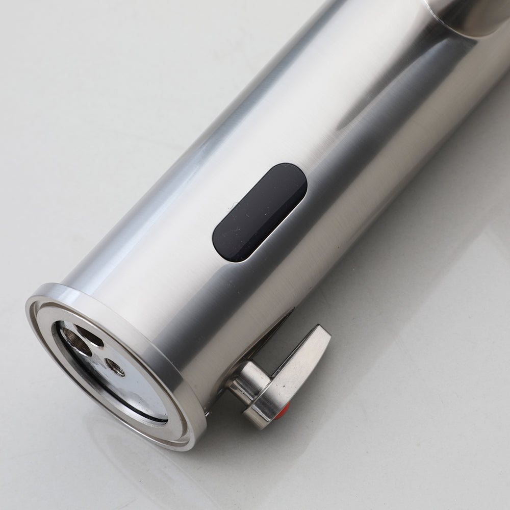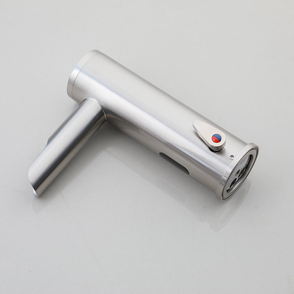 Nikkel geborstelde sensorkraan met een half open uitloop voor een sensationele werking.